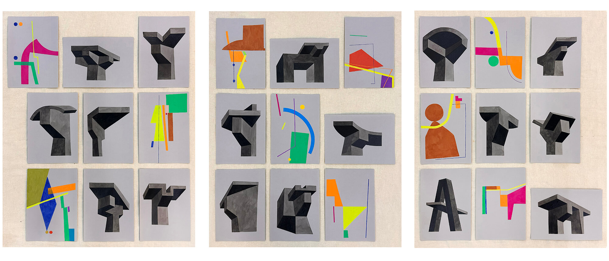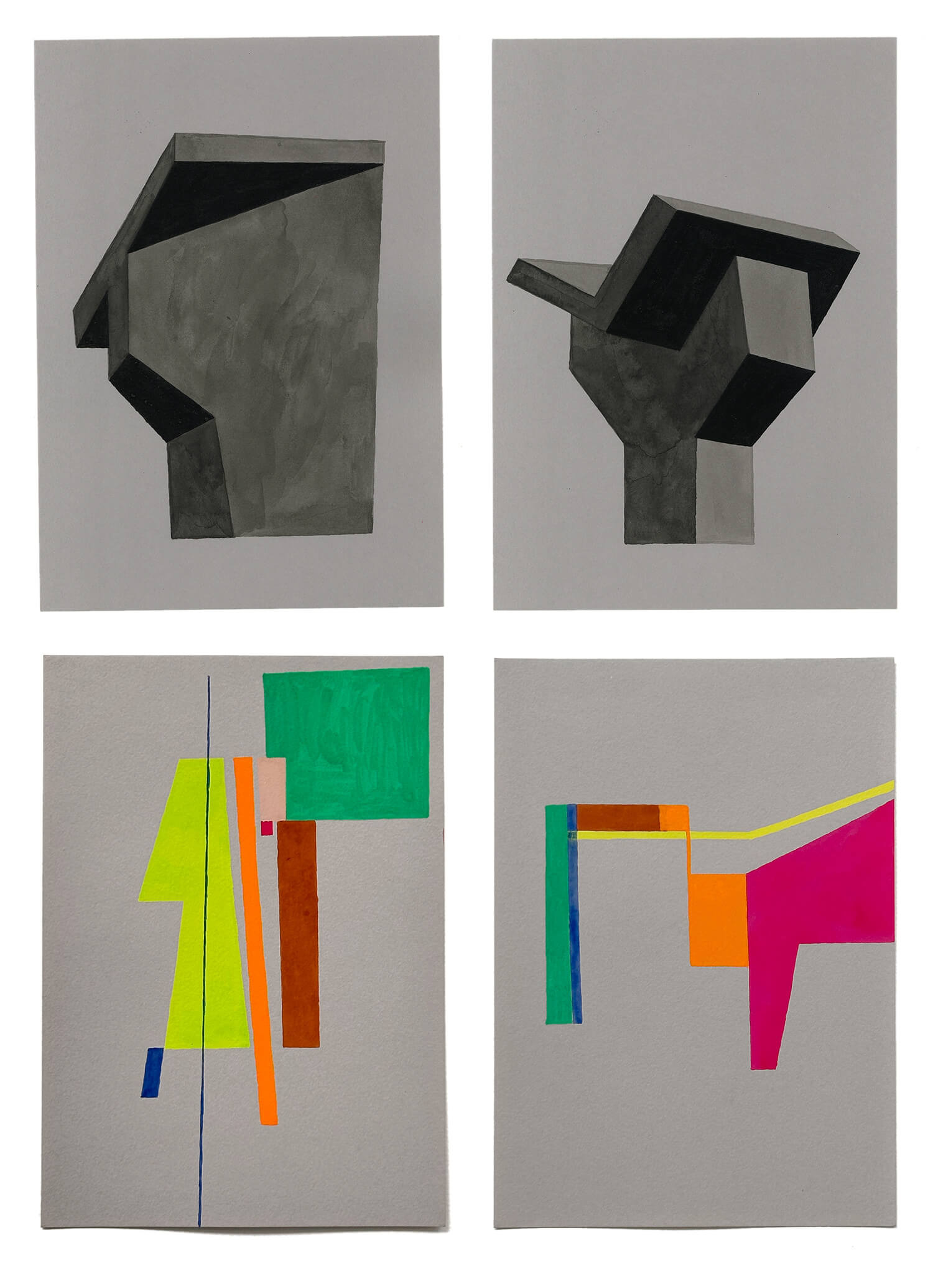 The column – linchpin of any kind of architectural or infrastructural endeavour is at the heart of this body of work – but a series of dysfunctional imagined brutalist columns. Modern metropolises in ‘developing’ countries begin to look like cities on stilts designed for vehicles – highly pedestrian unfriendly. The column ink paintings are interspersed with gouache paintings referencing architectural plan drawings with a lexicon reminiscent of Subway/metro maps, constructivist/bauhaus/post-modern design ethos, cartographic references, tetris, etc. The abrasive and retrofitted nature of urban planning and hasty development powered by the urgency to reap political dividends in ‘developing’ countries, often manifest in reverse-engineered ‘adjustments’ and absurd and/or potentially hazardous situations.