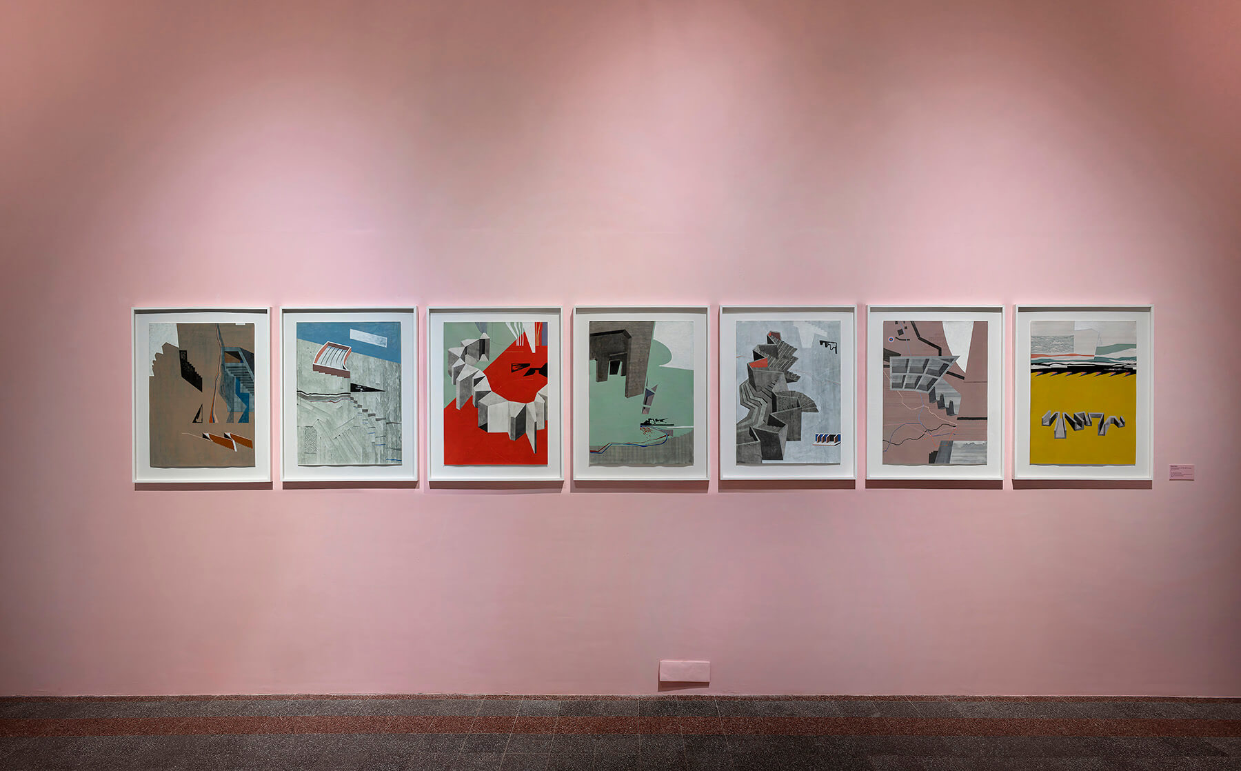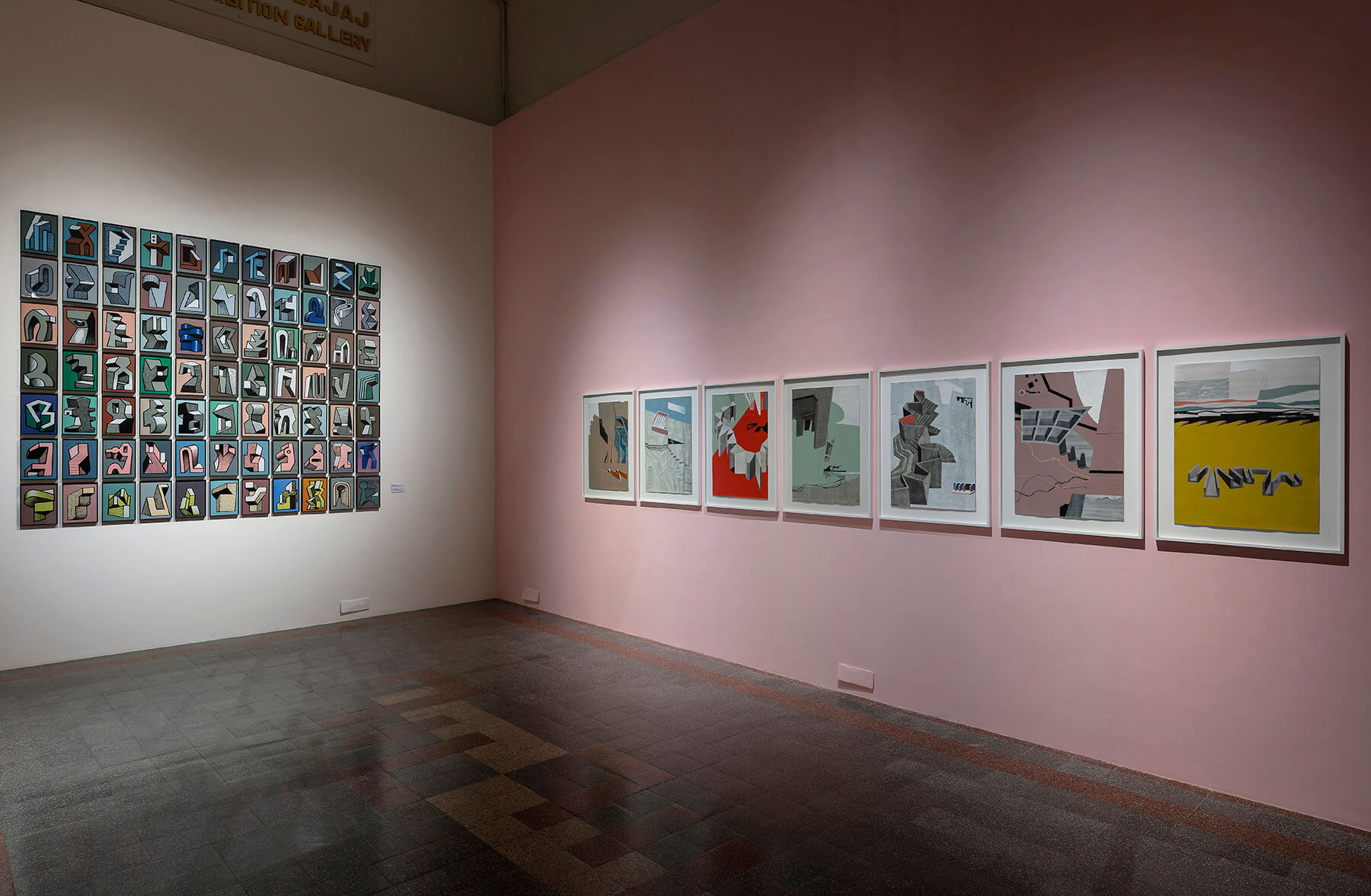 A series of paintings on paper, each frame of the work retains identifiable structures from the stadium. Kulavoor’s forms become increasingly whimsical and suggestive- blending observed features like wall folds, cantilevers, and angular support columns set alongside fictional markings like metro line maps and topographical drawings. A fragmented and disjointed language developed through this process, hinting at the degeneration of the stadium where interventions such as aluminium panels or patchy fixes break the continuity of the structure.